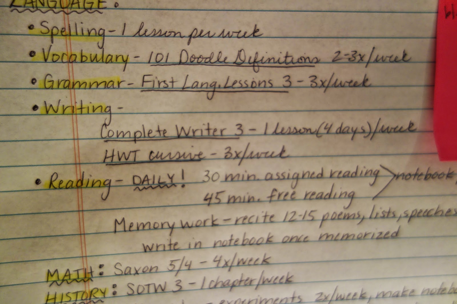 Then, every night I write out the following day's work in a spiral notebook so Asher can see exactly what needs to get done. I highlight everything that he can do without my help. That way, if I am busy with something else or out of the house, he is able to do what he can until I'm able to teach.